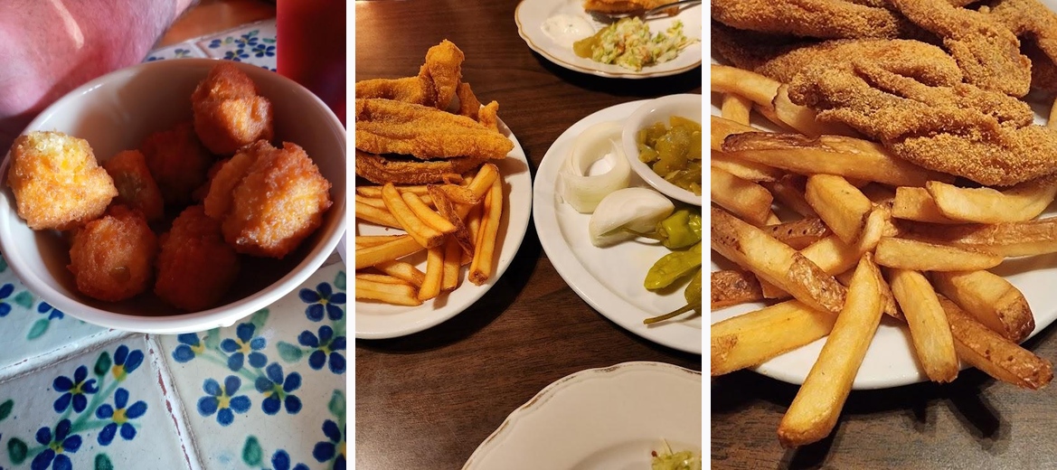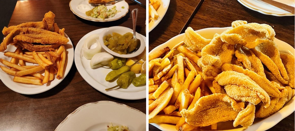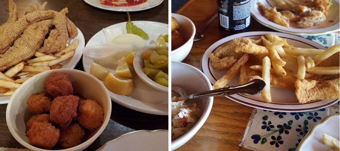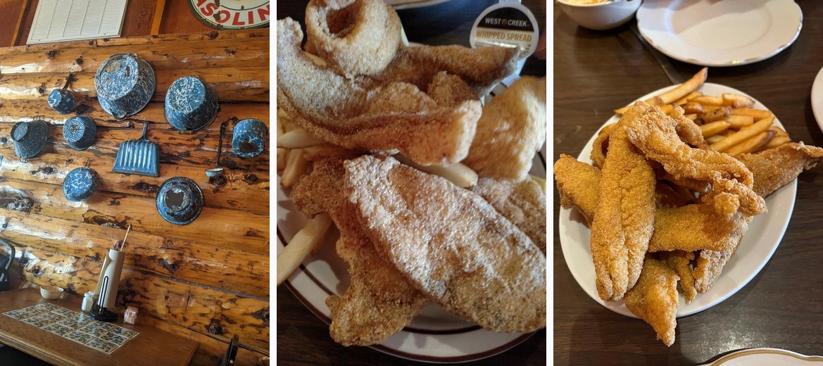 Absolutely wonderful place to eat, they have all you can eat Catfish filet Servers family style. You get French Fries, Coleslaw, hush pupies and Tomato relish included. Everything is all you can eat. The service is amazing, you feel like family as the owners still work here. The atmosphere is really cool with a fireplace and old signs. You won't be disappointed it's the best restaurant for miles.