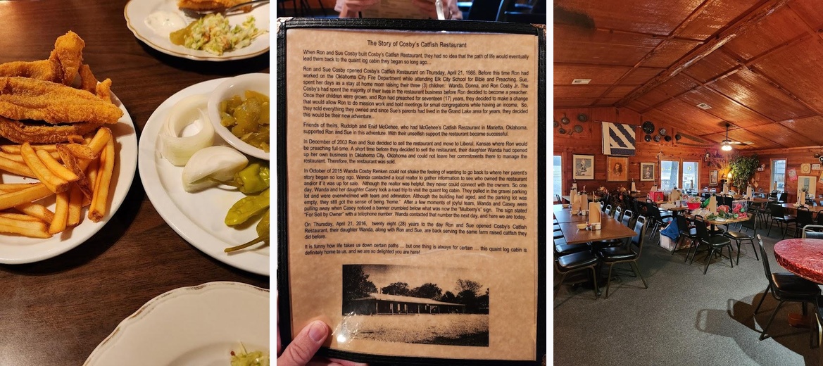 Cosby's Catfish Restaurant serves up a soul-satisfying experience with its all-you-can-eat catfish, straight from farm-raised Mississippi waters. This family-style dining spot serves french fries, rich homemade coleslaw, crispy hush puppies, and a colorful relish plate to accompany the catfish. Alongside catfish, patrons can also enjoy hearty 1/3 pound burgers or a hand-cut 10 oz Ribeye steak, making it a go-to for meat lovers as well. Located in Eucha, Oklahoma, just seven miles east of Disney, this restaurant offers a cozy atmosphere ideal for families, groups, or anyone craving delicious comfort food.